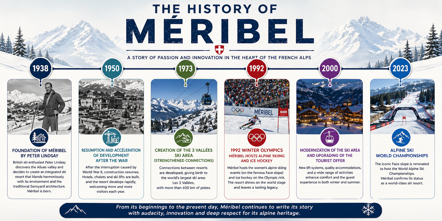 From its humble beginnings in a remote valley to its current status as an international resort, Méribel embodies a unique success story in the history of Alpine tourism. Visionary from the outset thanks to Peter Lindsay, it has evolved without ever losing sight of its core identity.